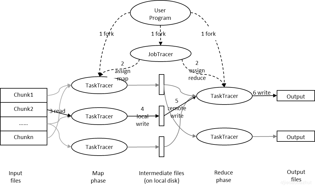 用户提交任务给JobTracer,JobTracer把对应的用户程序中的Map操作和Reduce操作映射至TaskTracer节点中;输入模块负责把输入数据分成小数据块,然后把它们传给Map节点;Map节点得到每一个key/value对,处理后产生一个或多个key/value对,然后写入文件;Reduce节点获取临时文件中的数据,对带有相同key的数据进行迭代计算,然后把终结果写入文件。