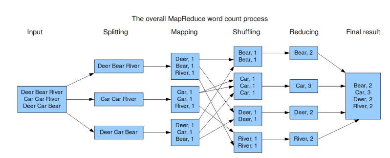 reduce函数:接受一个键,以及相关的一组值(例如上图中Shuffling后的结果),将这组值进行合并产生一组规模更小的值(通常只有一个或零个值)(例如上图中Reduce后的结果)